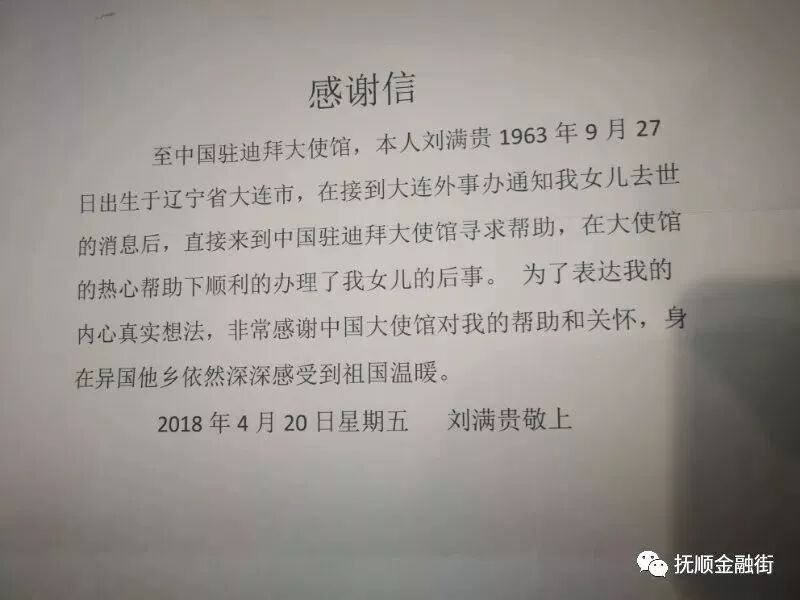 大连侨胞刘娜于2017年12月在迪拜心脏病突发意外死亡,由于各种原因尸体一直沒有火化,死者父亲刘满贵于今年4月8日求助领事馆。阿联酋辽宁商会、大连商会范业伟会长接到李涛副领事通知由商会出面协助死者家属办理火化事宜,商会第一时间派商会常务副会长李萌,抚顺侨商会阿联酋分会会长张扬赶到领事馆了解情况并及时安置家属住宿,带家属到政府各部门办理火化手续,经过近半个月的奔走,于4月20日下午4点30分死者父亲刘满贵带着死者骨灰盒顺利登机。