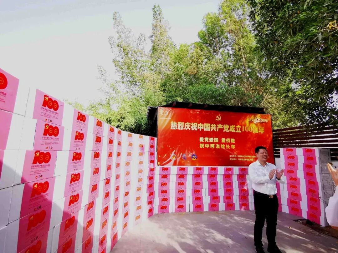 自新冠疫情爆发以来,中国政府及驻阿联酋使领馆高度重视海外侨胞的生命安全和身体健康,各商协会和社团也一直积极为在阿华侨华人抗疫防疫提供必要的帮助。活动当天,各商会会长在高温户外条件下布置捐赠现场,在每一箱 Camelicious 骆驼奶上都细心地贴上了“庆祝中国共产党成立100周年”的红色标语。